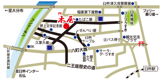 〒875-0041 大分県臼杵市唐人町5組 TEL0972-62-5223 FAX0972-62-5247 営業時間/AM11:30~PM2:00(オーダーストップ) PM5:00~PM9:00(オーダーストップ) 休日/不定休